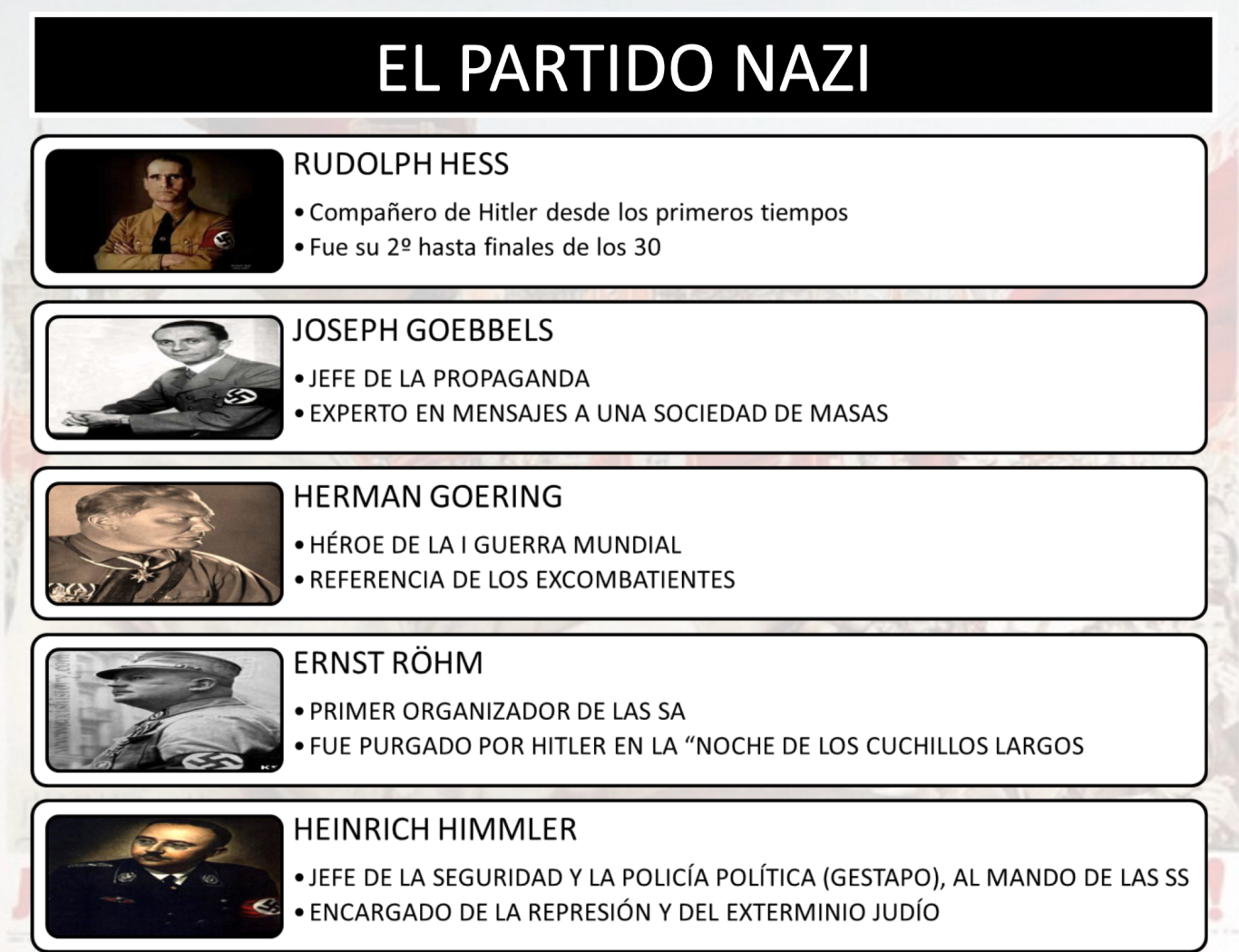 Líderes del Partido Nacionalsocialista. Organizaciones de Partido Nacionalsocialista. El Estado Nazi. Política económica. Incremento del gasto, Obras públicas y rearme. Política interior. Las leyes de Nüremberg. Política exterior. El Lebensraum (espacio vital)